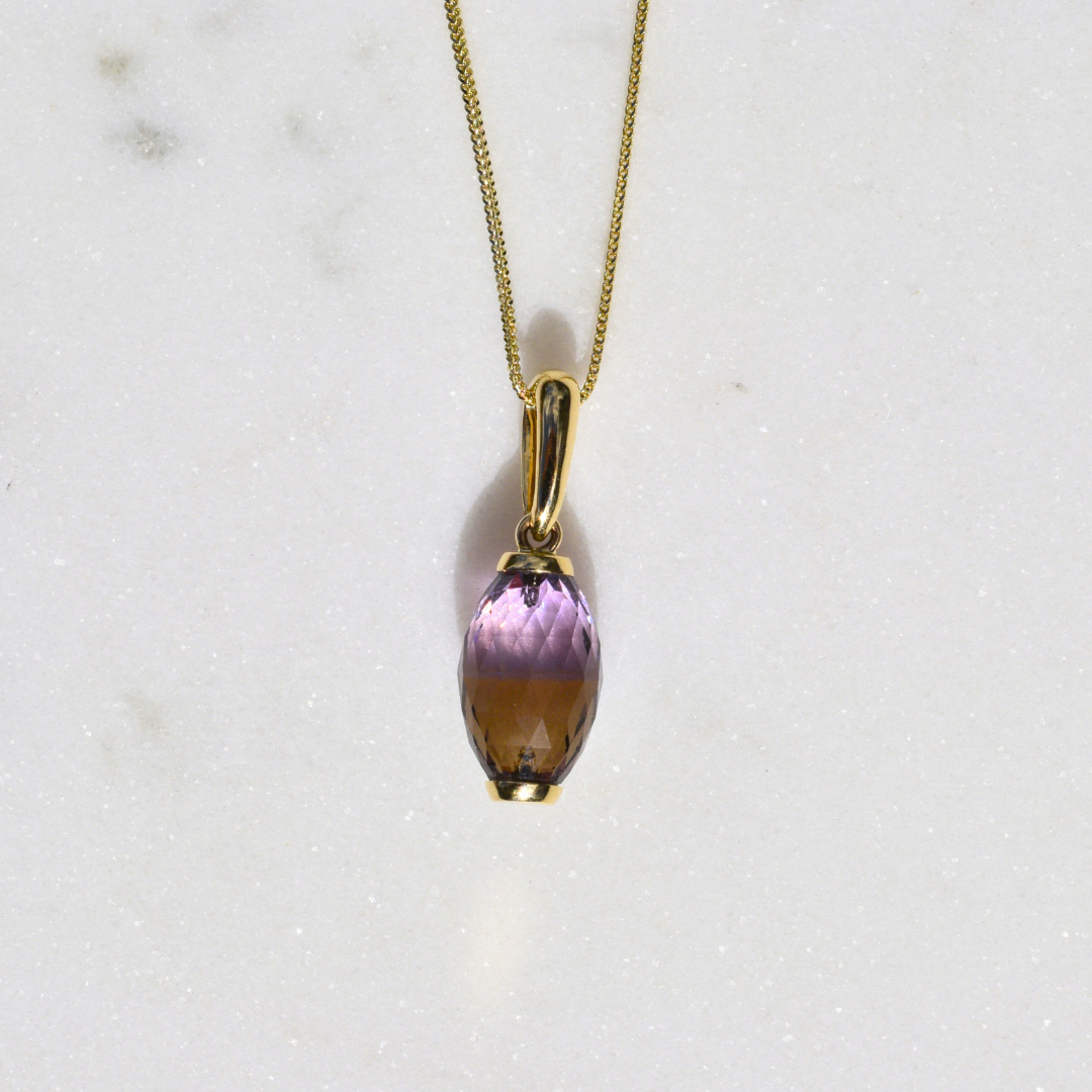 This pendant features a faceted ametrine briolette set in 14K two-tone gold, suspended from a 20-inch chain. The natural gradient of golden citrine to violet amethyst makes each piece one of a kind, blending warm and cool tones in a timeless design.