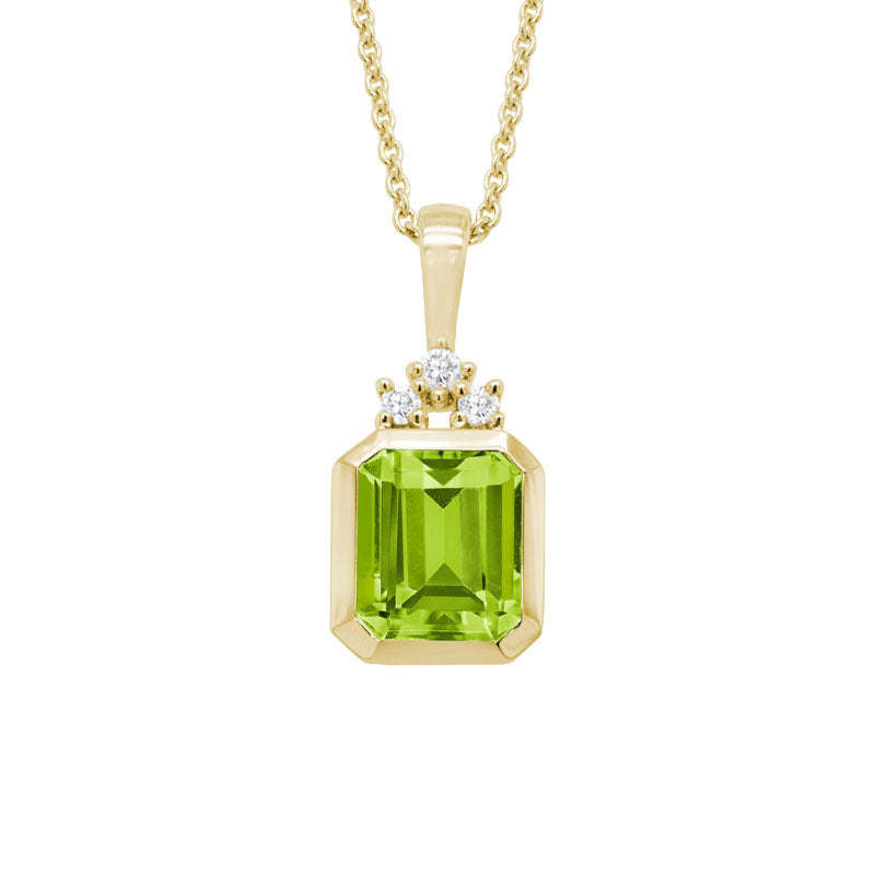 This 14K yellow gold pendant features a striking emerald-cut peridot crowned with a trio of sparkling round diamonds. Set on an adjustable 16–18" chain, it’s a vibrant and elegant piece perfect for adding a fresh pop of color to your collection.