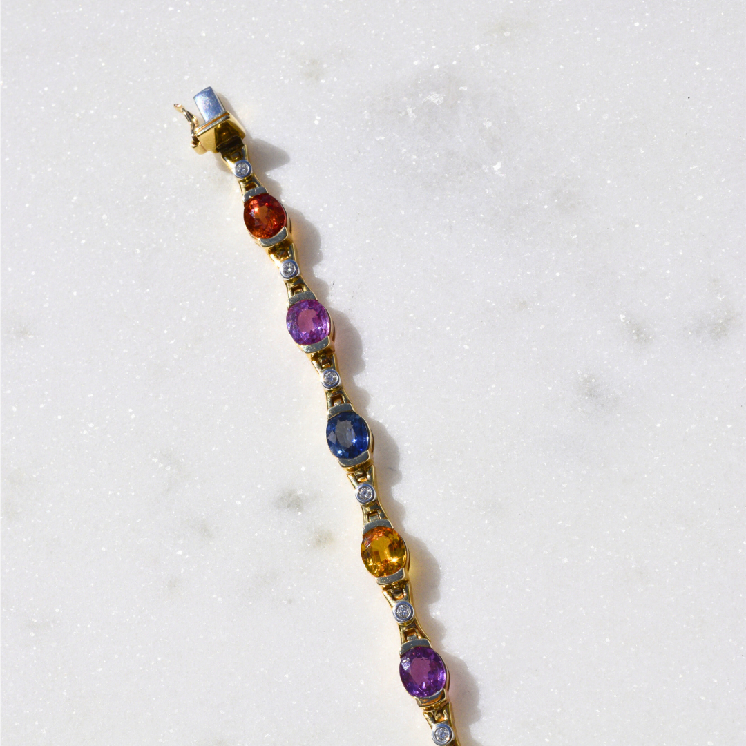 Crafted in 14K yellow gold, this exquisite bracelet showcases a curated spectrum of oval-cut sapphires in shades of pink, blue, orange, yellow, green, and violet. Each sapphire is bezel or prong set and separated by sparkling round diamonds, adding light and elegance to the colorful design. The sleek, articulated setting ensures a comfortable fit while maximizing visual impact. Finished with a secure box clasp and safety latch, this bracelet is a joyful statement of color, perfect for marking a milestone or simply brightening everyday wear.