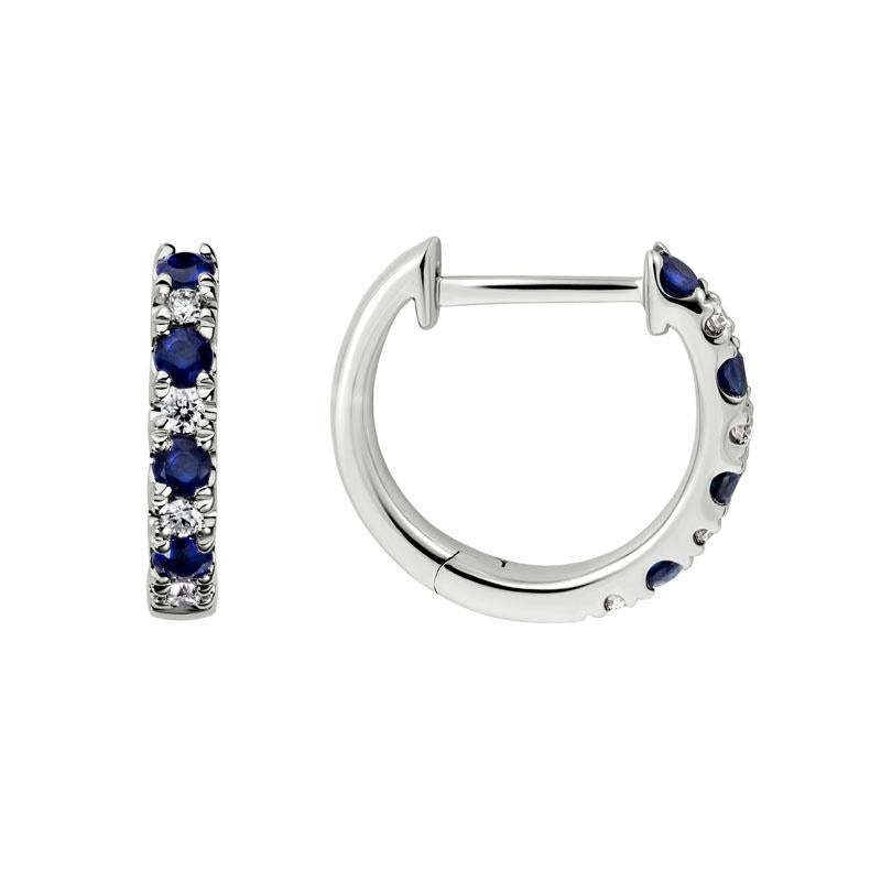 These petite huggie earrings feature alternating round sapphires and diamonds set in 14K white gold. A timeless design with a touch of color, they offer classic sparkle in a compact size perfect for everyday wear.
