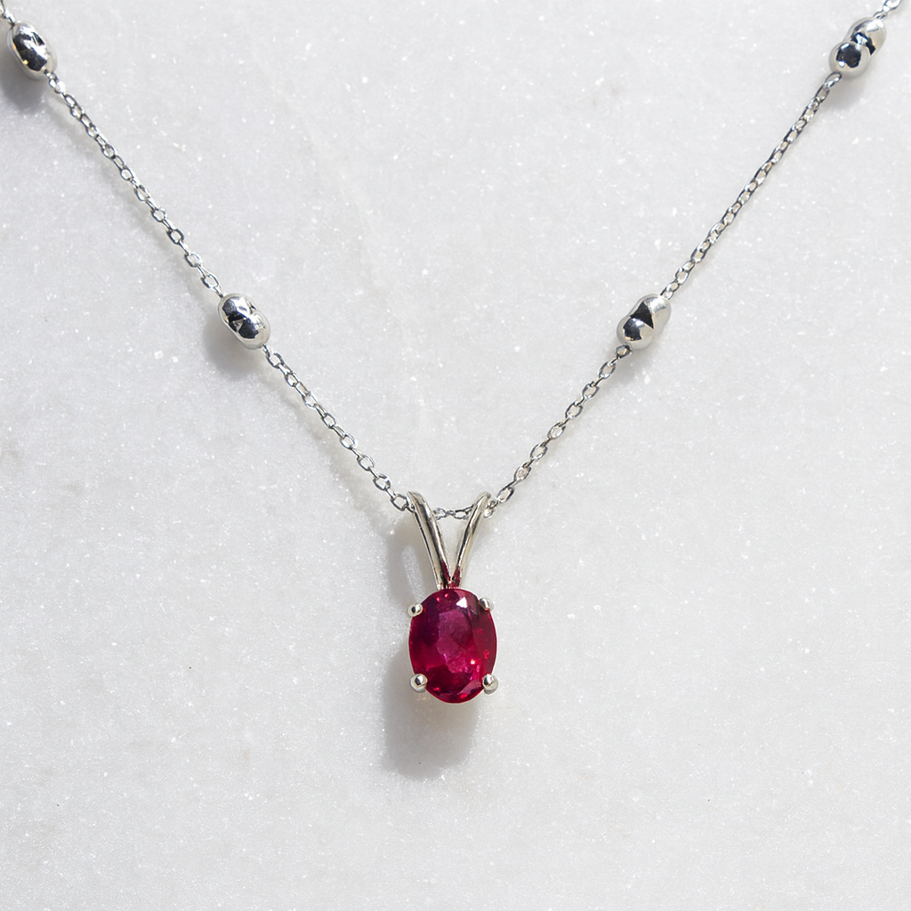 This necklace features a stunning 7x5mm oval garnet in a rich raspberry hue, set in sleek white gold with a refined double-bail design. Perfect for adding timeless elegance to any look Paired with 18" ovalina chain.