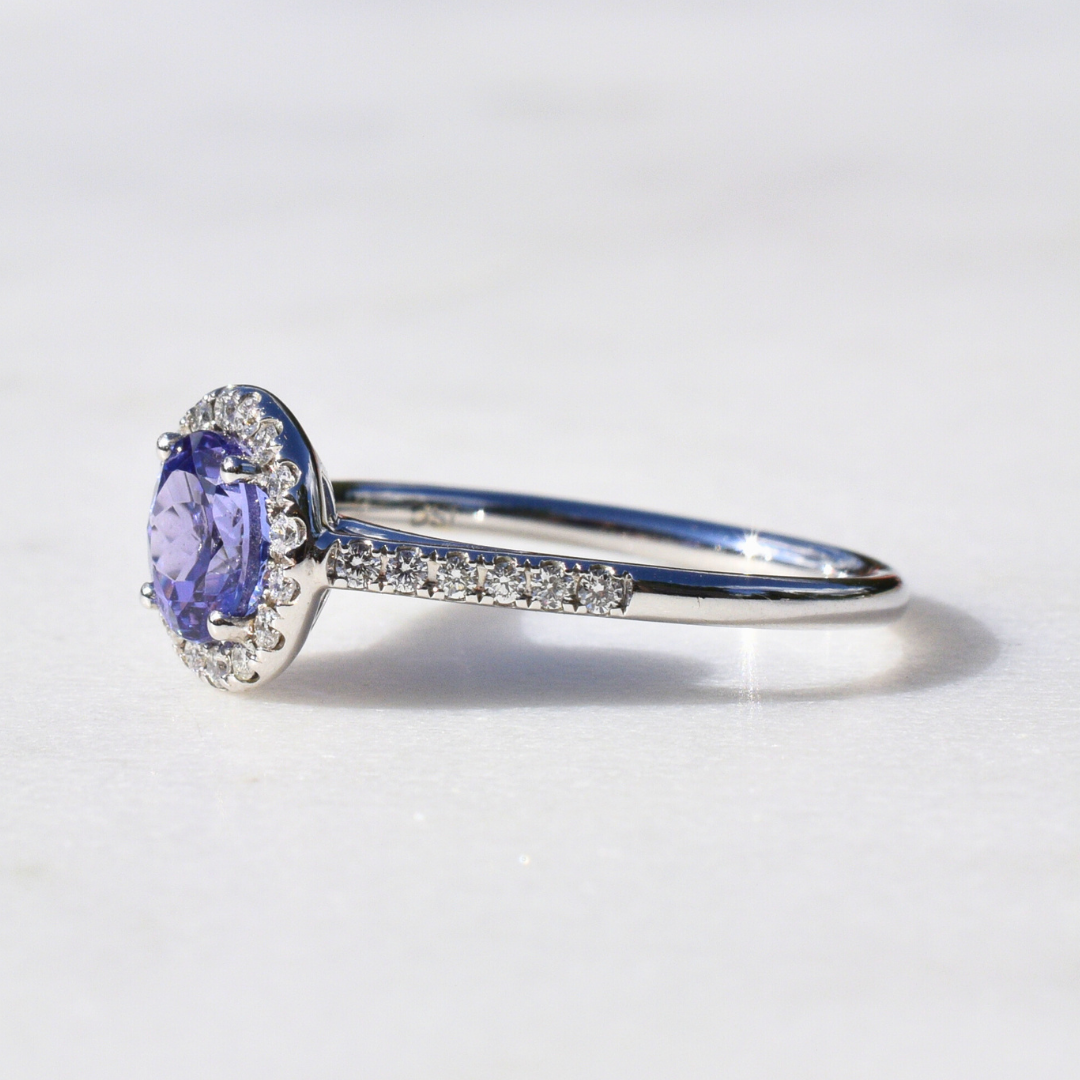 This elegant 14K white gold ring features a vibrant round tanzanite framed by a sparkling halo of round brilliant diamonds, with diamond accents along the band for added brilliance and sophistication.