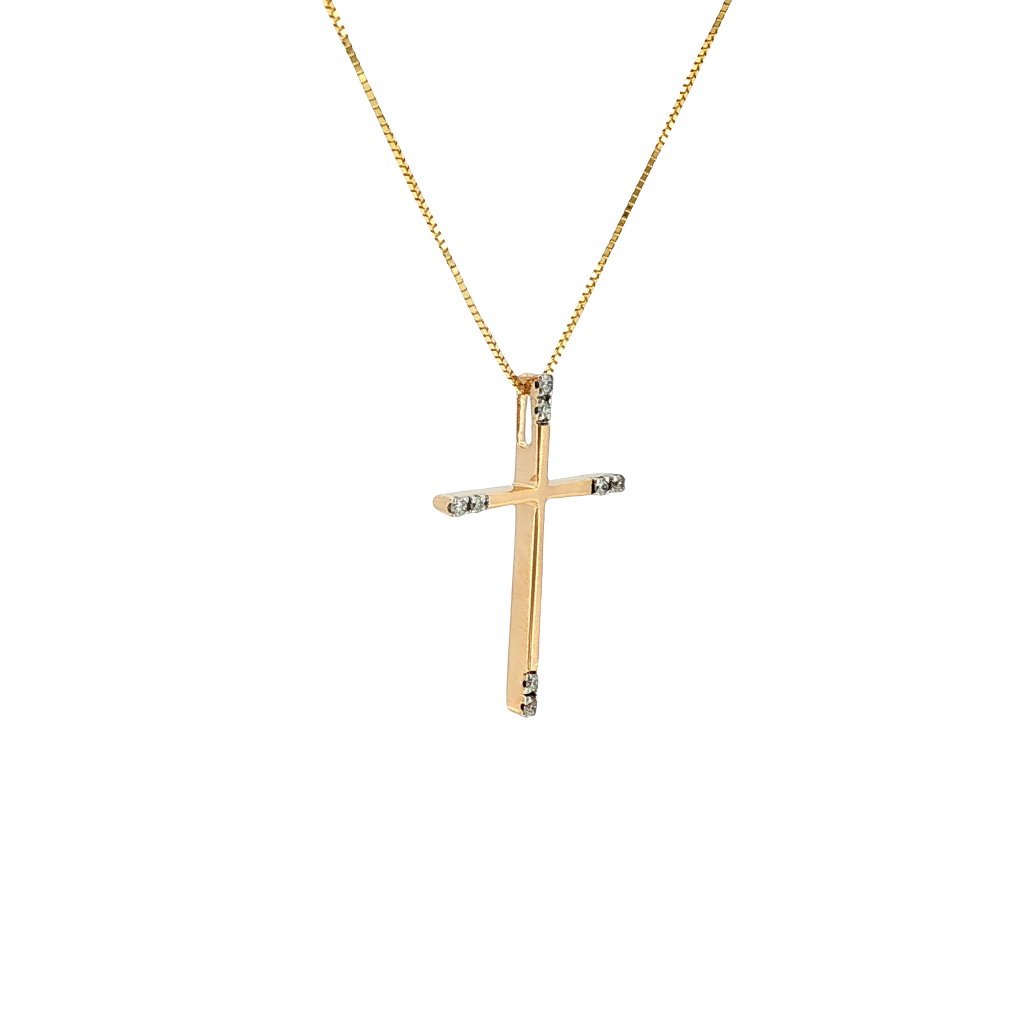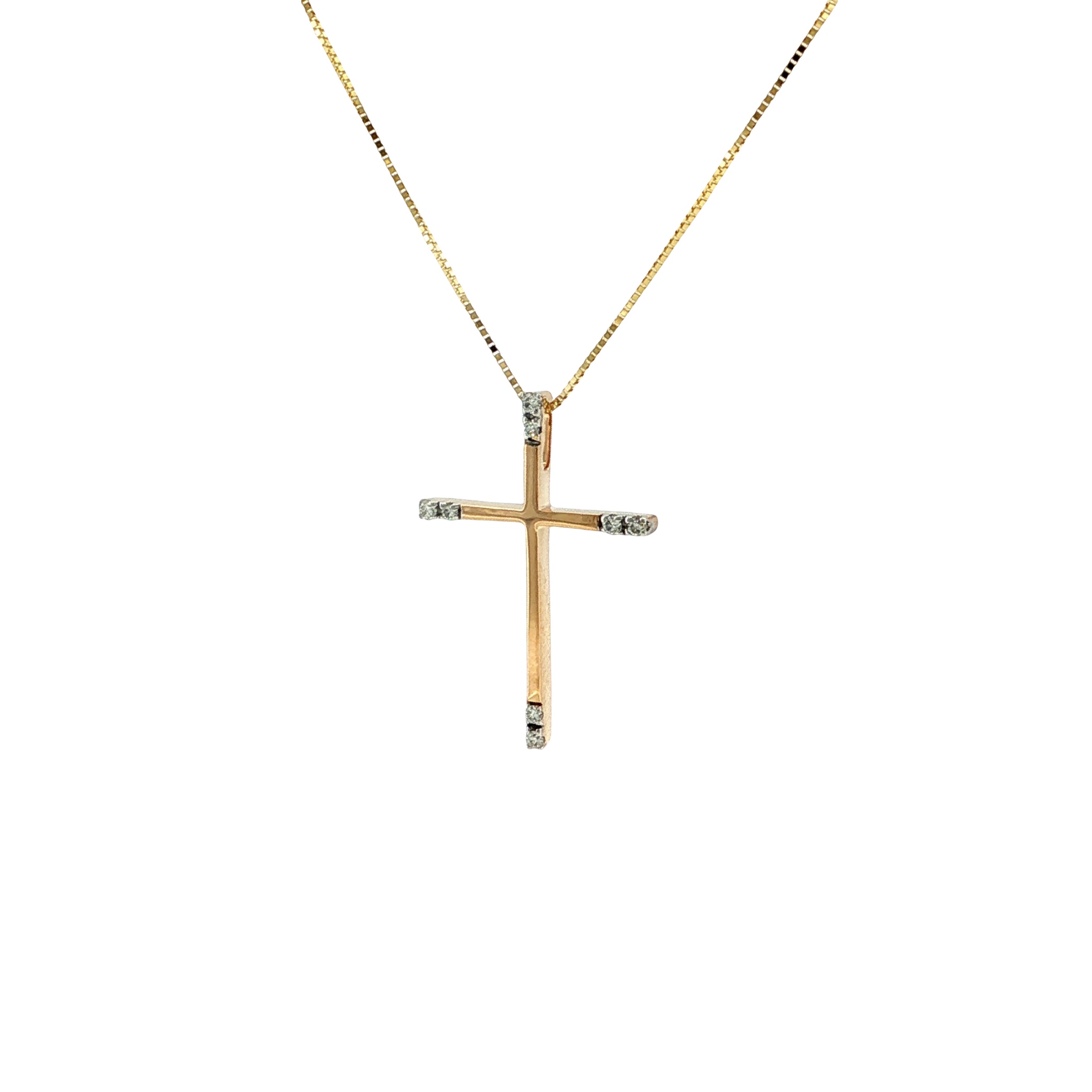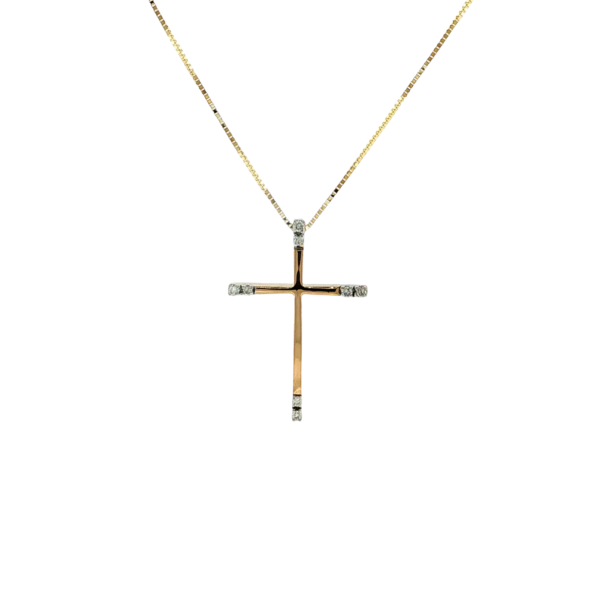 A classic cross in 14K yellow gold, accented with shimmering diamonds at each end. Suspended from an 18" light box chain, this timeless design offers subtle sparkle and everyday elegance.