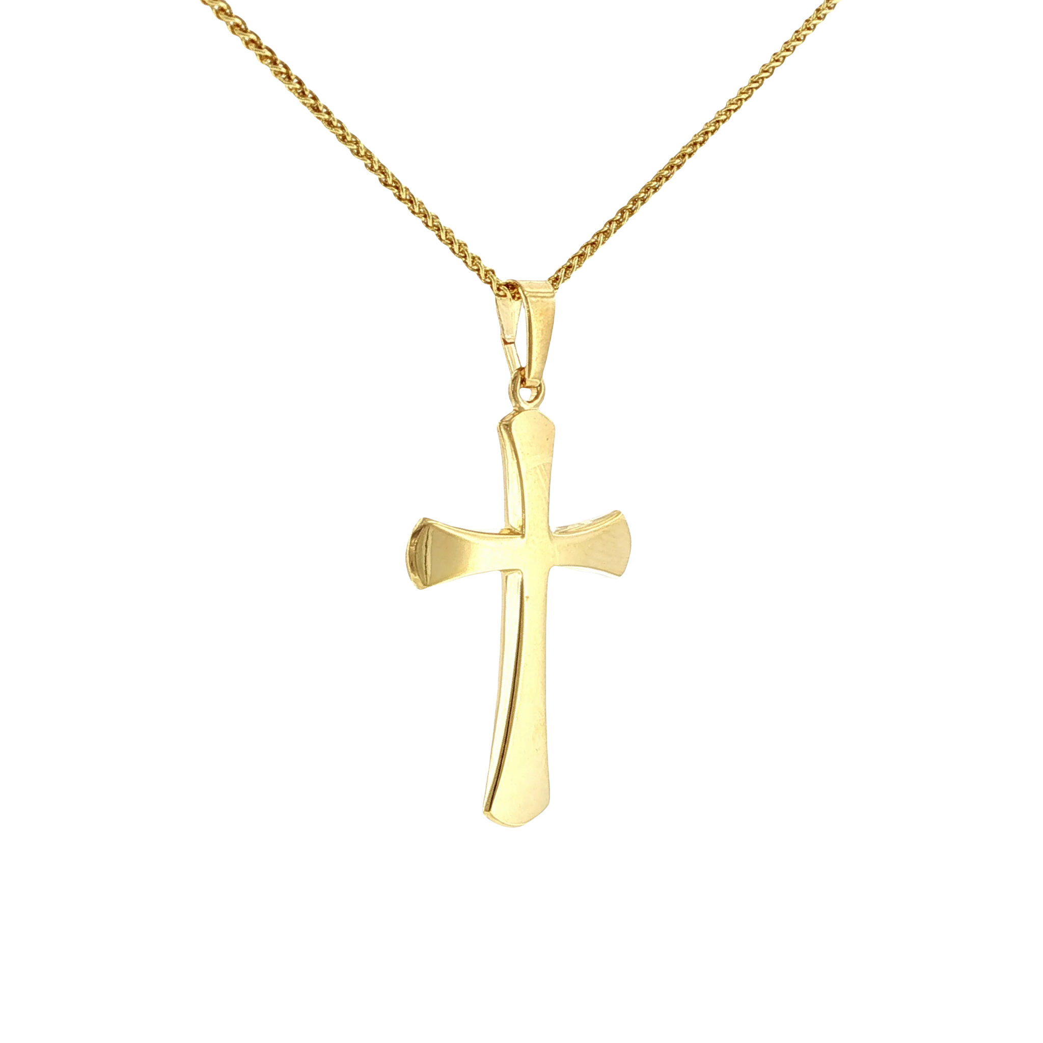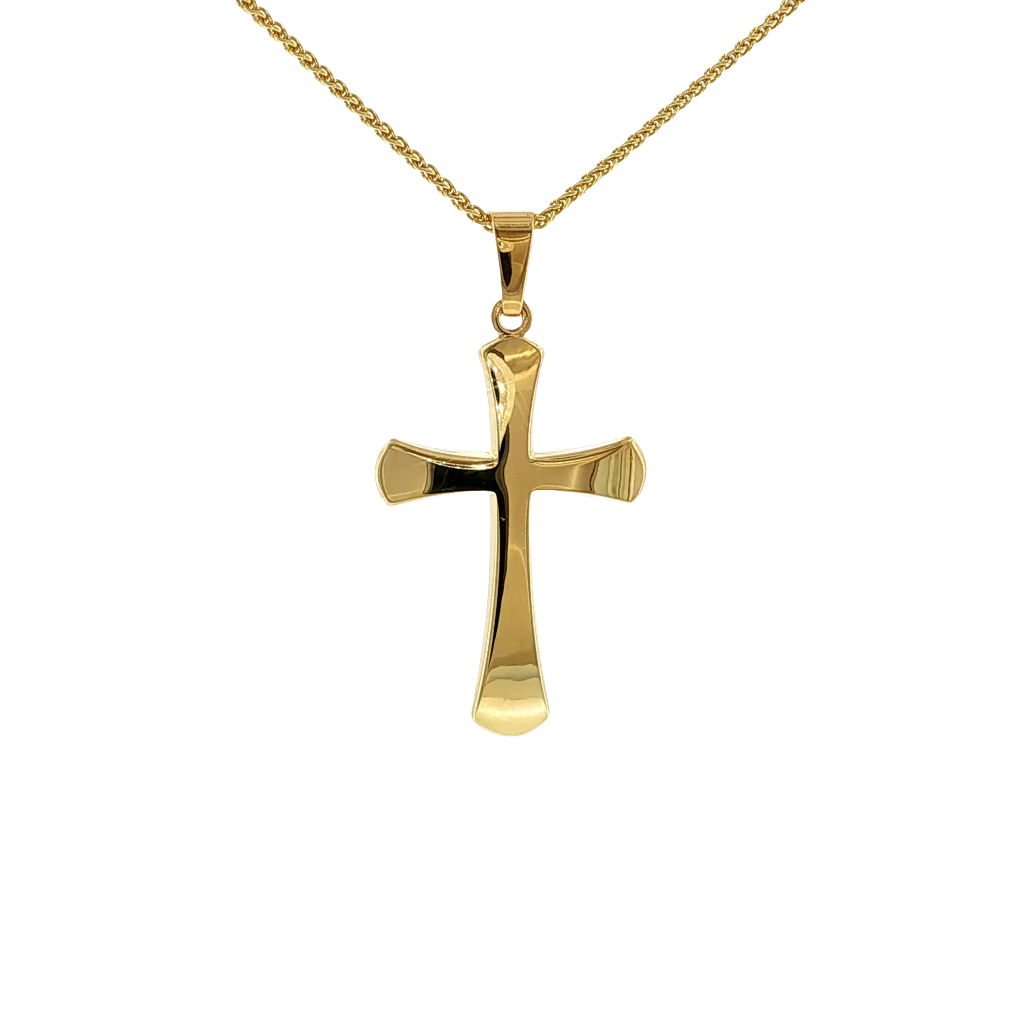 Sleek and sculptural, this 14K yellow gold cross features a softly domed, flared silhouette that catches the light beautifully. A modern take on a timeless symbol, it offers bold presence with a smooth, polished finish. Finished on a 18" wheat chain.