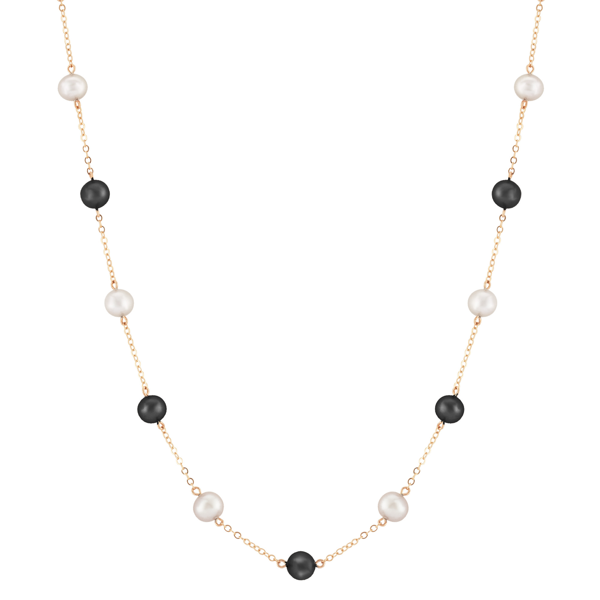 Elegant with a bold twist, this 14K yellow gold choker showcases a striking blend of luminous 5mm white freshwater pearls and smooth matte black onyx beads. The alternating pattern creates a balanced, eye-catching look, perfect for layering or wearing solo. Crafted with a fine gold cable chain and secured with a lobster claw clasp, this 18-inch necklace offers a contemporary take on a classic silhouette—ideal for both daytime styling and evening wear.