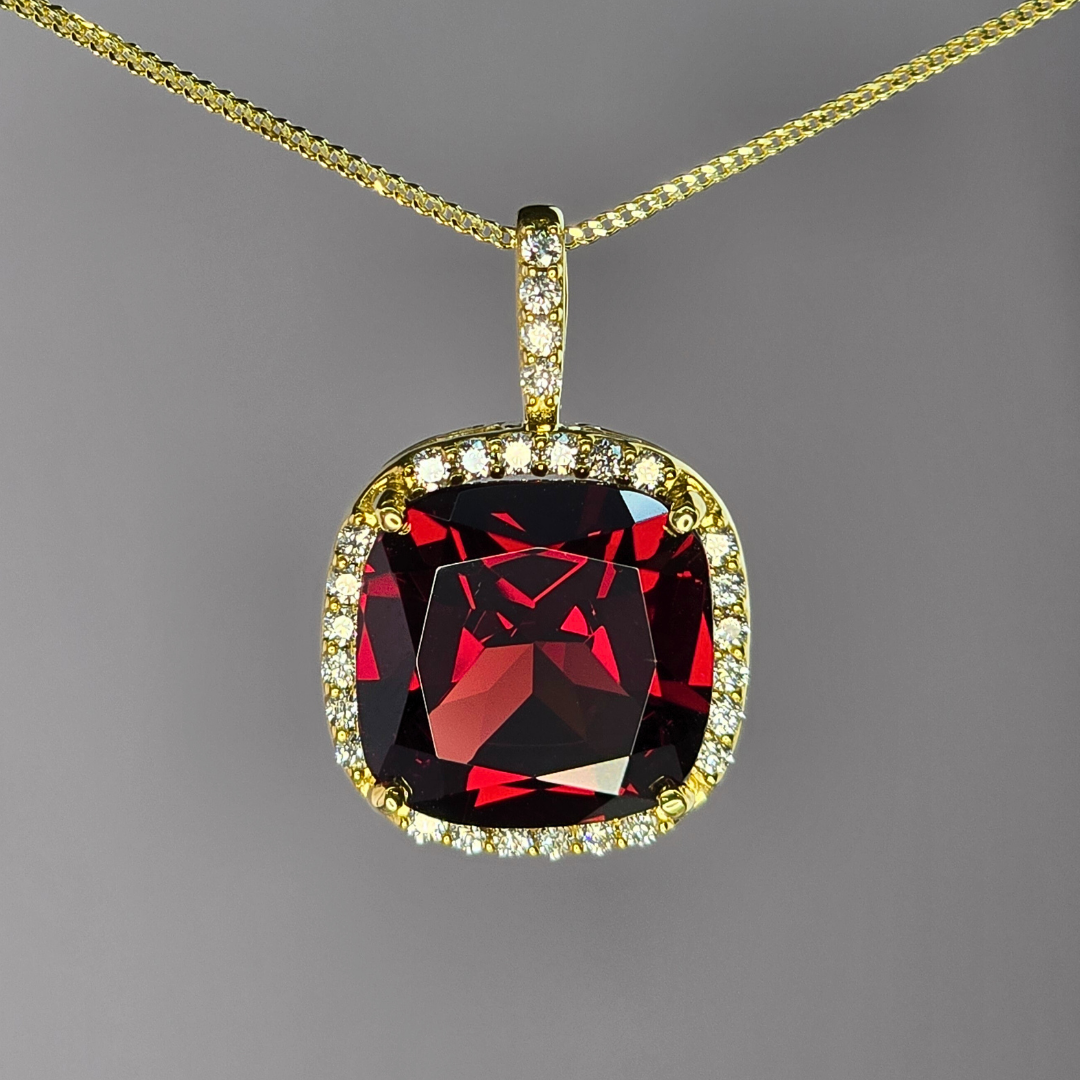 Create an accountSet in rich 18K yellow gold, this stunning pendant features a deep crimson 12x12mm cushion-cut garnet framed by a halo of round brilliant diamonds totaling approximately 0.25 carats. The diamonds continue onto the bail for extra brilliance. The pendant is paired with an 18" 14K yellow gold foxtail Singapore chain, known for its intricate twisting pattern and reflective shine. This piece combines warmth, sparkle, and timeless beauty - ideal for January birthdays or anyone who loves bold color and fine craftsmanship.