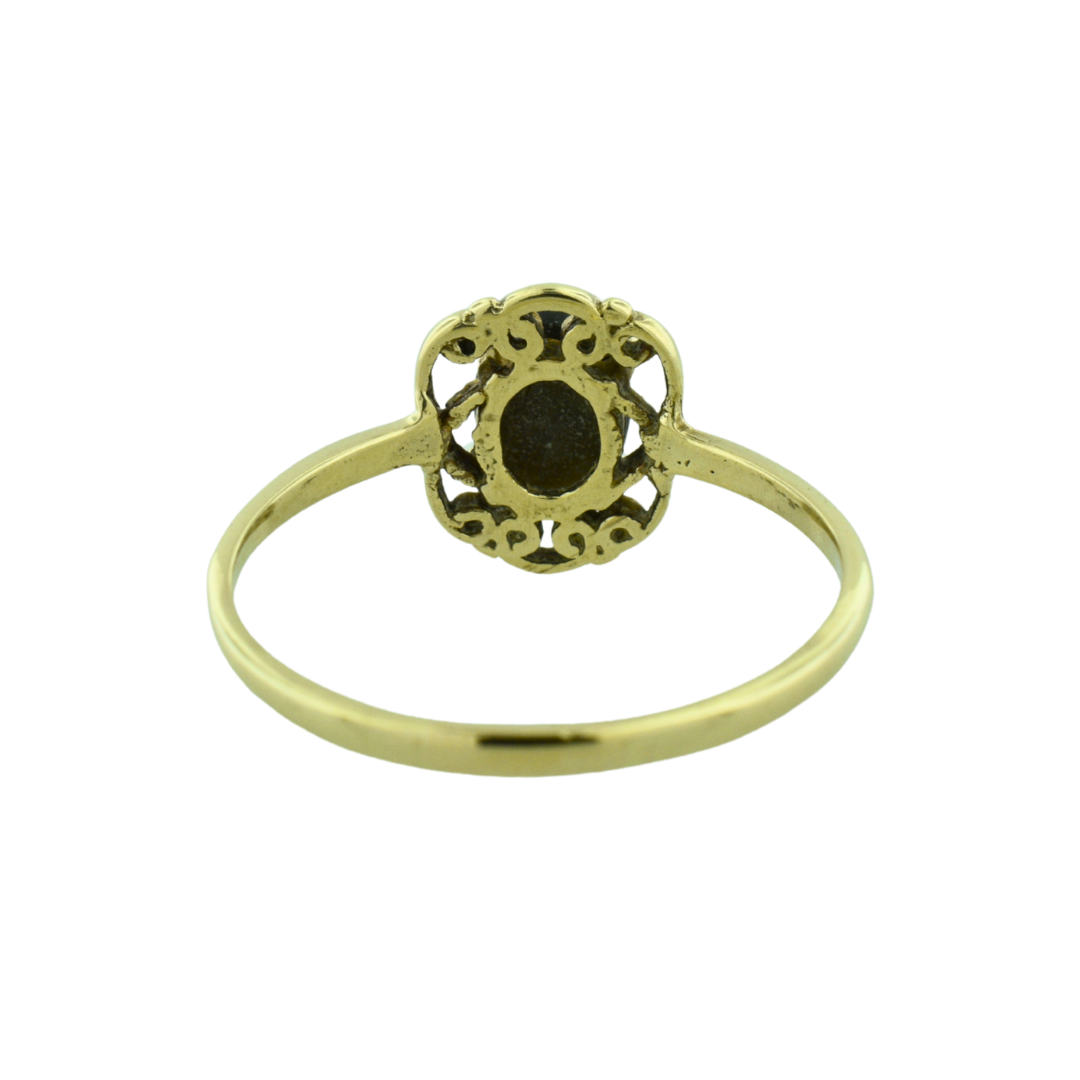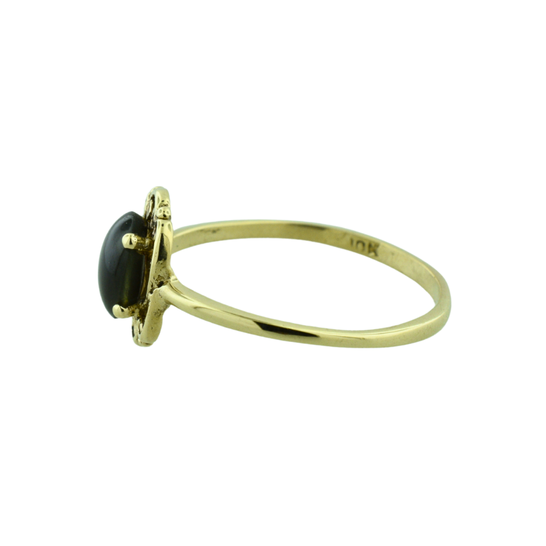 This estate ring features a 7x5mm oval black cabochon set in an ornate 10K yellow gold scrollwork frame. Delicate and vintage-inspired, it offers a graceful silhouette with antique charm and bold contrast.