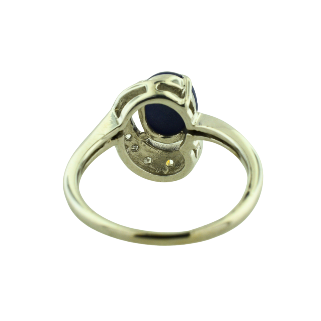 Size 7.25. This elegant estate ring features a rich blue cabochon gemstone set in 14K white gold, accented by six sparkling single-cut diamonds in a graceful swoop design.