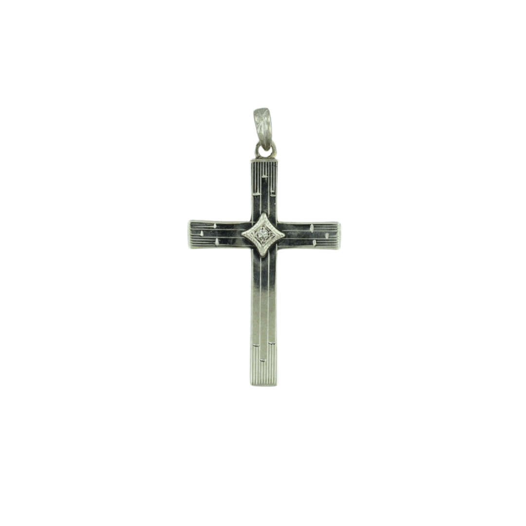 Crafted in 14K white gold, this estate cross pendant features fine engraved detailing and a single-cut diamond at the center, weighing approximately 0.015 carats. A subtle yet meaningful piece with vintage character and timeless faith-inspired style.