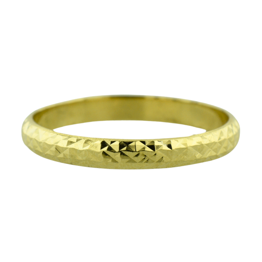 Size 7. Delicately crafted in 14K yellow gold, this lightweight estate ring features a shimmering diamond-cut pattern that catches the light beautifully. Perfect as a stackable band or subtle standalone piece.