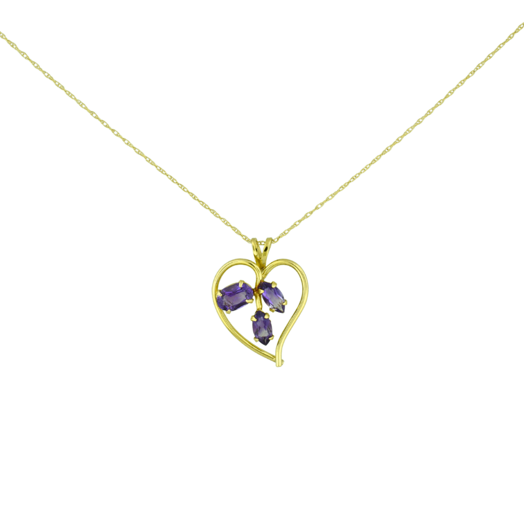 A graceful open-heart design in 14K yellow gold, accented with three marquise-cut amethysts for a touch of color and elegance. Suspended from an 18" chain, this estate pendant embodies timeless romance and refined charm.
