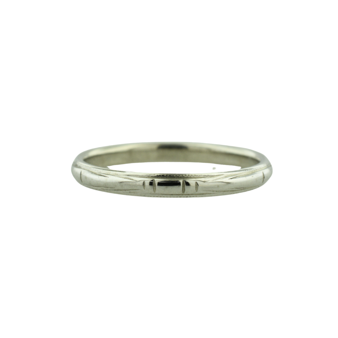 This estate band is crafted in 18K white gold and features delicate etched detailing around the entire shank. Measuring 2.3mm wide, it’s perfect as a vintage-style wedding band or a dainty stackable accent with subtle texture and shine.