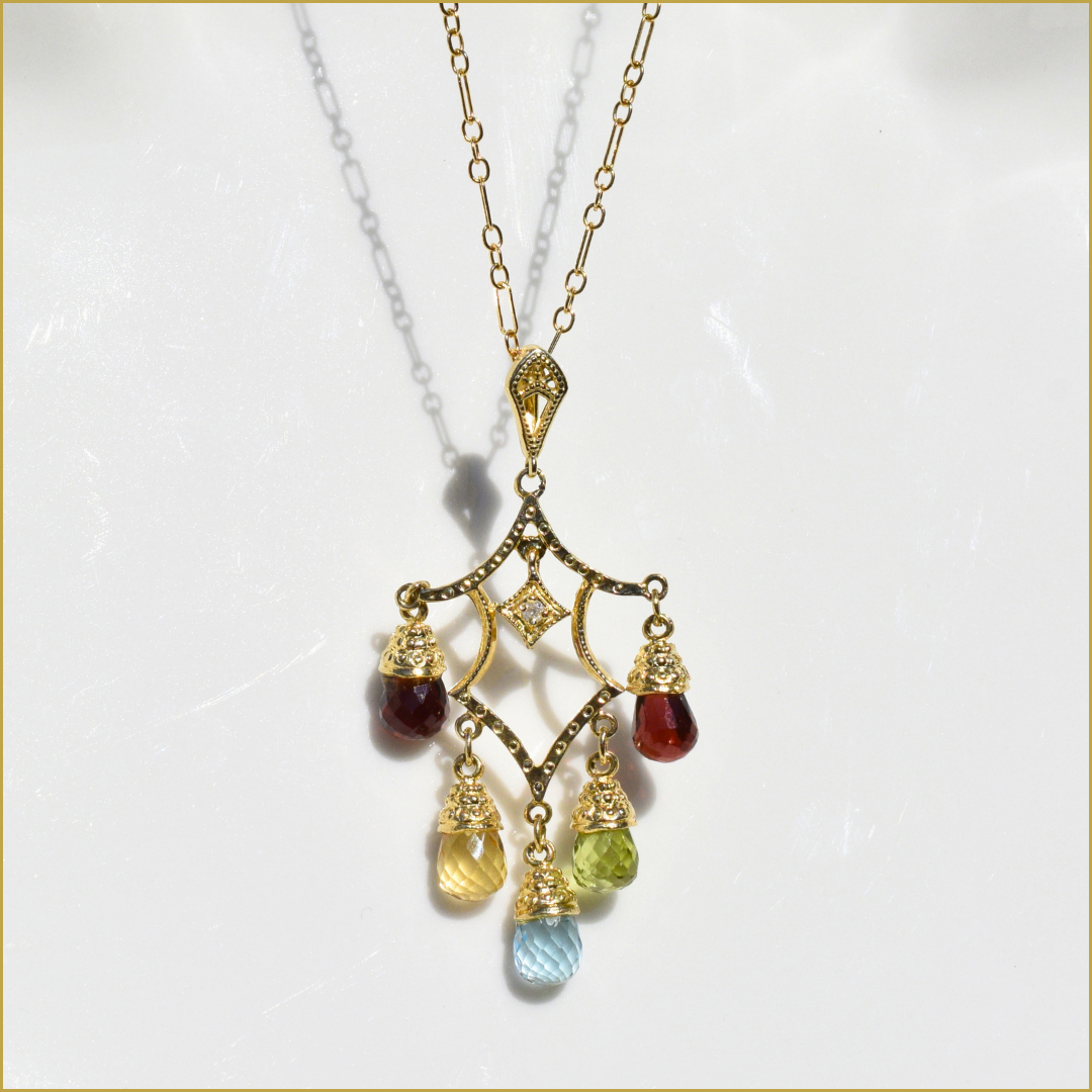 This vintage-inspired 14K yellow gold chandelier pendant dazzles with colorful briolette-cut gems and delicate diamond accent. A whimsical, one-of-a-kind statement. Paired with 18" estate elongated cable chain.