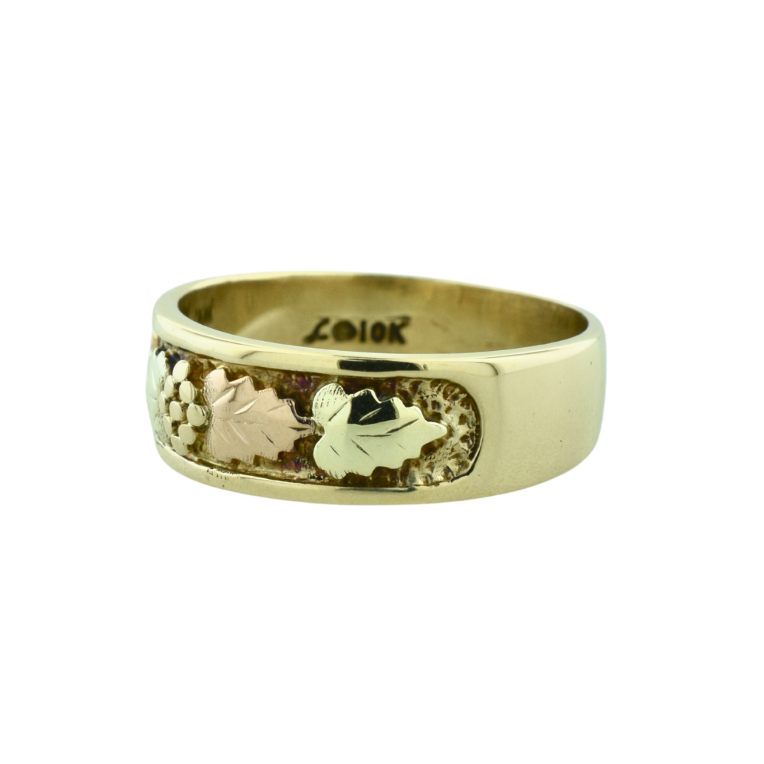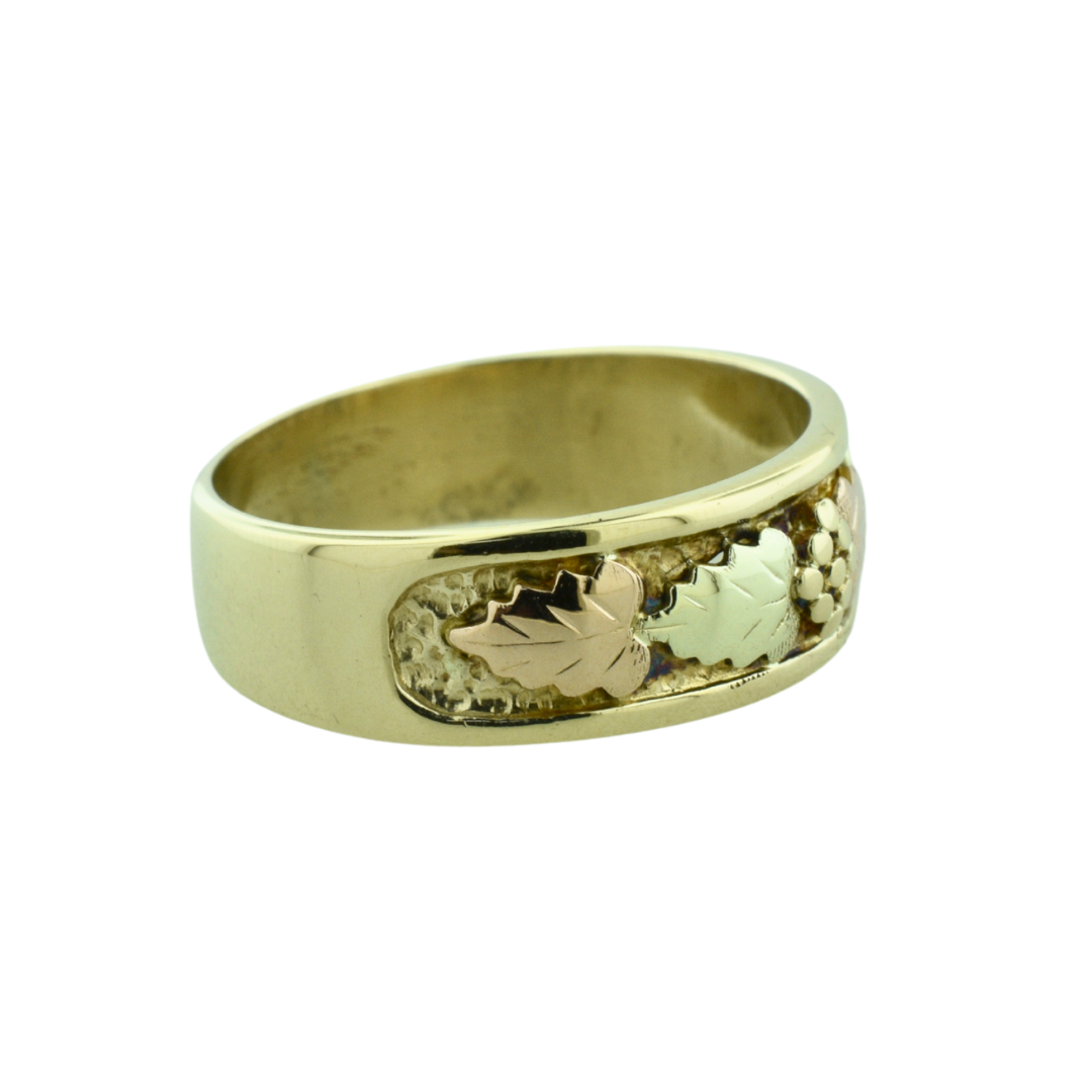 A classic Black Hills Gold design featuring rose, green, and yellow gold leaves with a textured background. Crafted in 10K yellow gold, this band blends warm tones and intricate detail for a timeless, nature-inspired look.