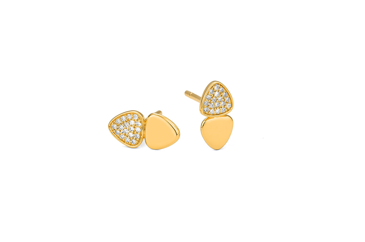 Sleek and sculptural, these duo stud earrings combine modern geometry with timeless shimmer. Each earring features two soft triangular shapes—one adorned with pavé-set round brilliant diamonds (0.10 carats total weight, H color, SI clarity), and the other in high-polish 14K yellow gold.