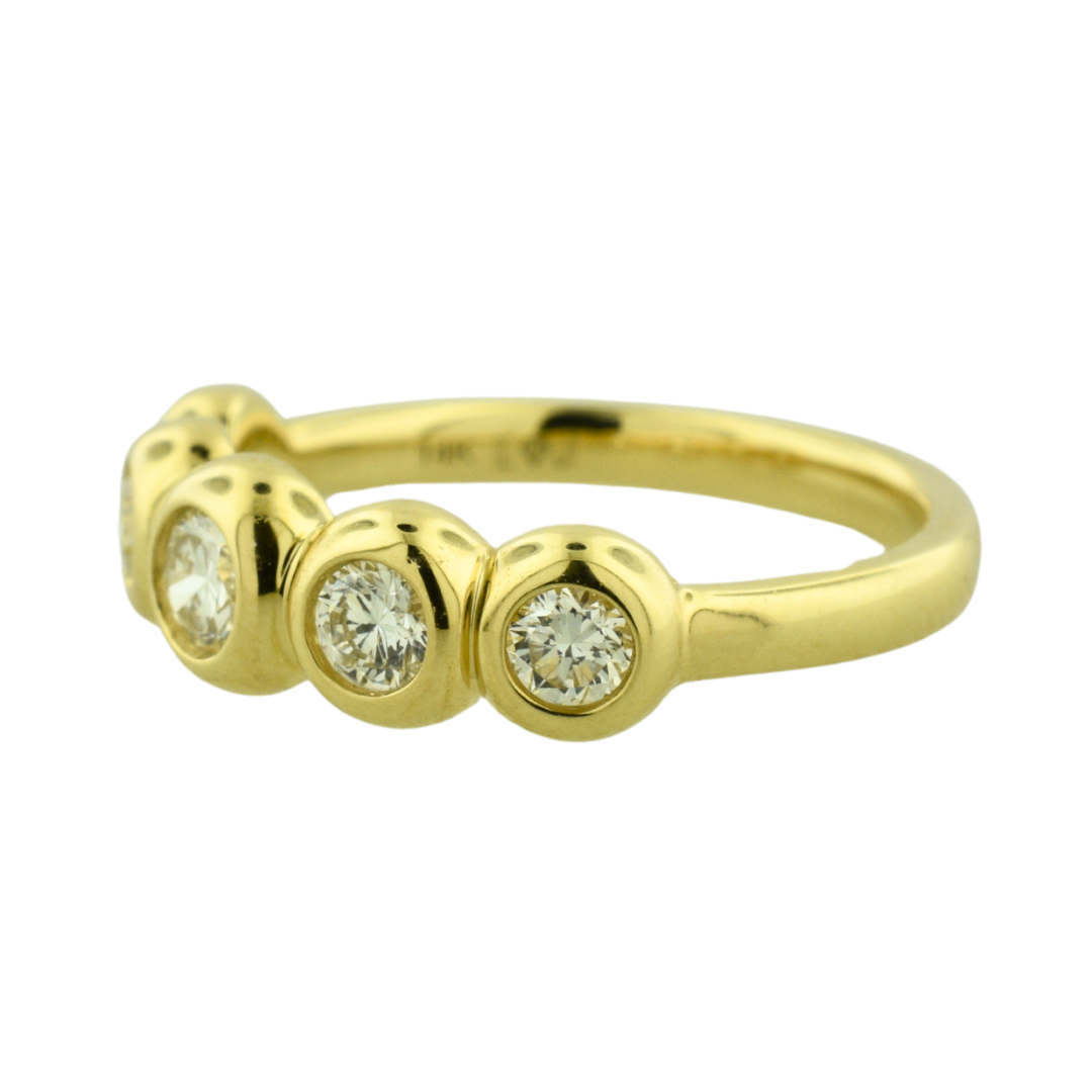 This playful yet elegant 14K yellow gold ring features lab-grown diamonds totaling 5/8 carat, each bezel-set in a graduated bubble-style design. A bold, modern look perfect for stacking or solo wear.