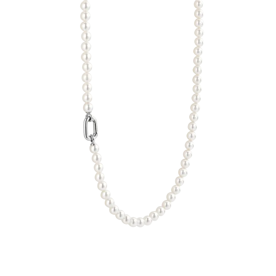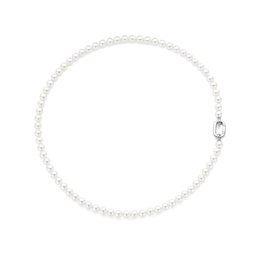 Crafted from premium 925 sterling silver, this design showcases a fluid line of high-lustre pearls, each chosen for its smooth surface and soft glow. A polished platinum-plated signature link clasp provides a bold, contemporary accent.
