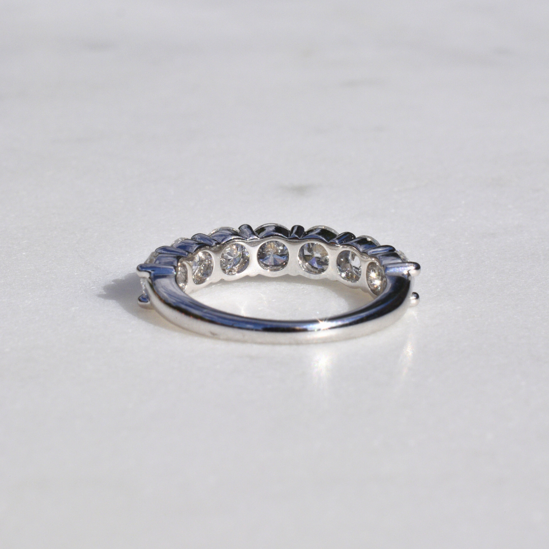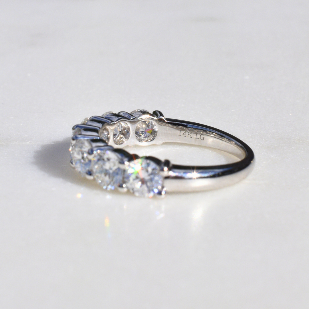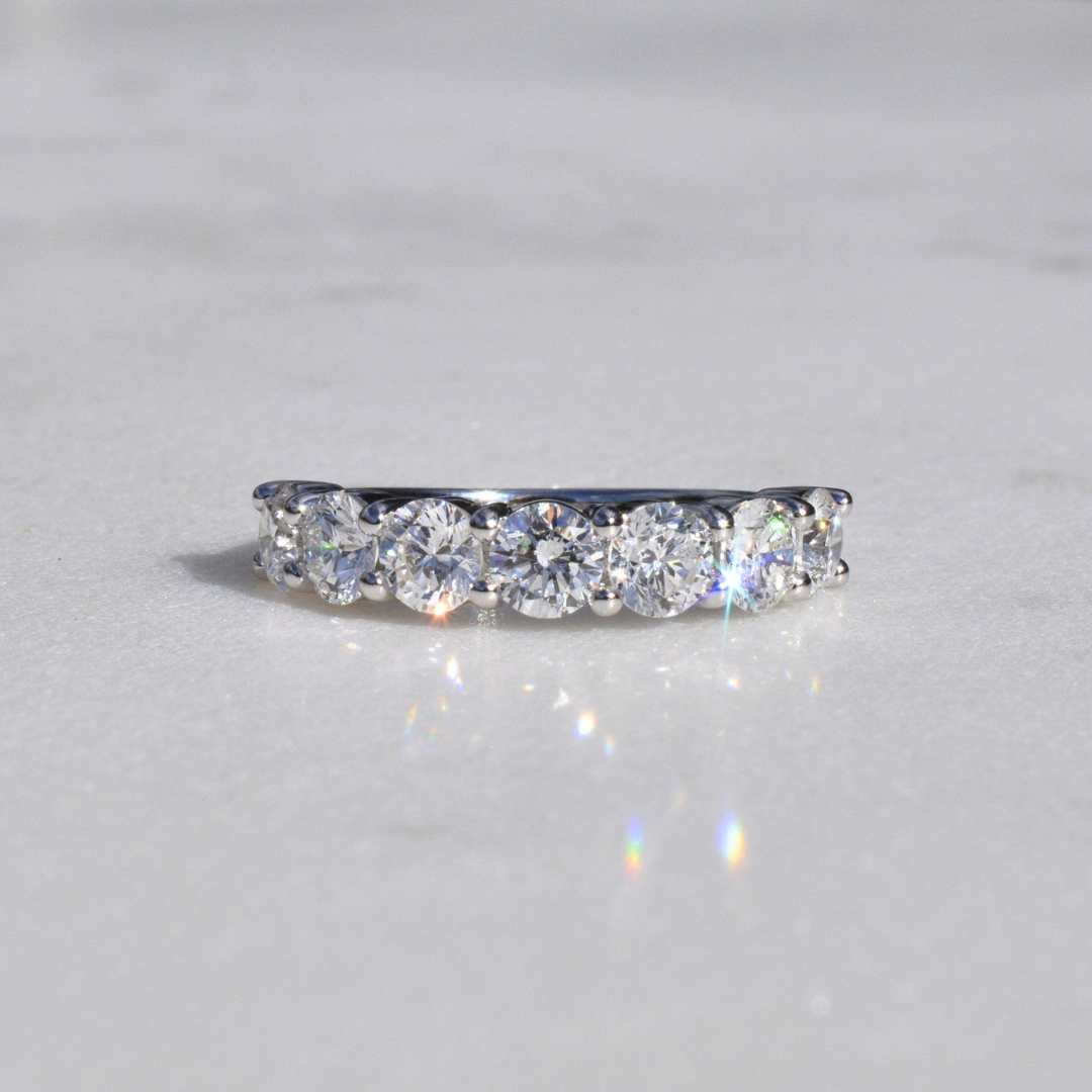 Create an accountThis elegant 7-stone diamond band is crafted in 14K white gold and set with seven lab-grown round brilliant diamonds totaling 2.20 carats. Each diamond is G–H color and VS clarity, offering exceptional brilliance and a clean, bright look. The shared-prong setting maximizes light return while maintaining a secure, low-profile fit. Perfect as a wedding band, anniversary ring, or sparkling statement stacker, this band combines timeless design with the ethical beauty of lab-grown diamonds. A refined choice for anyone who values classic style and conscious luxury.