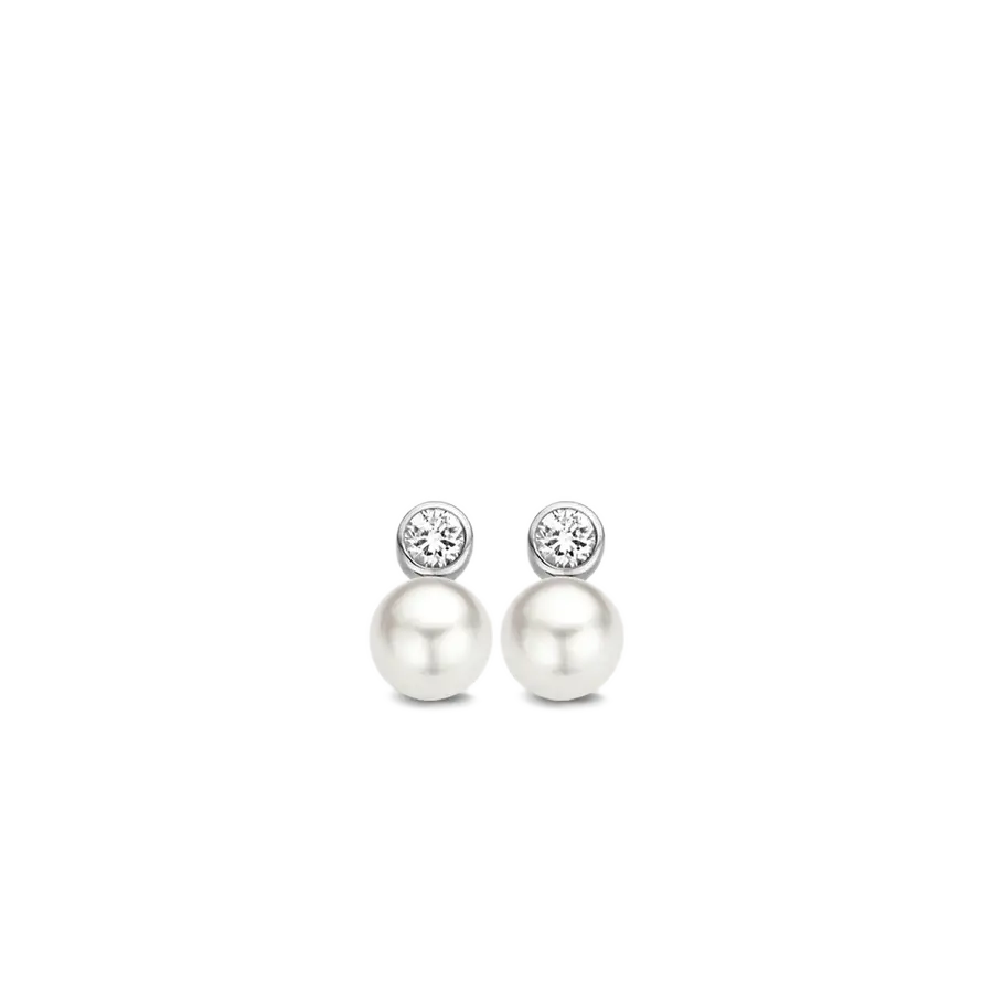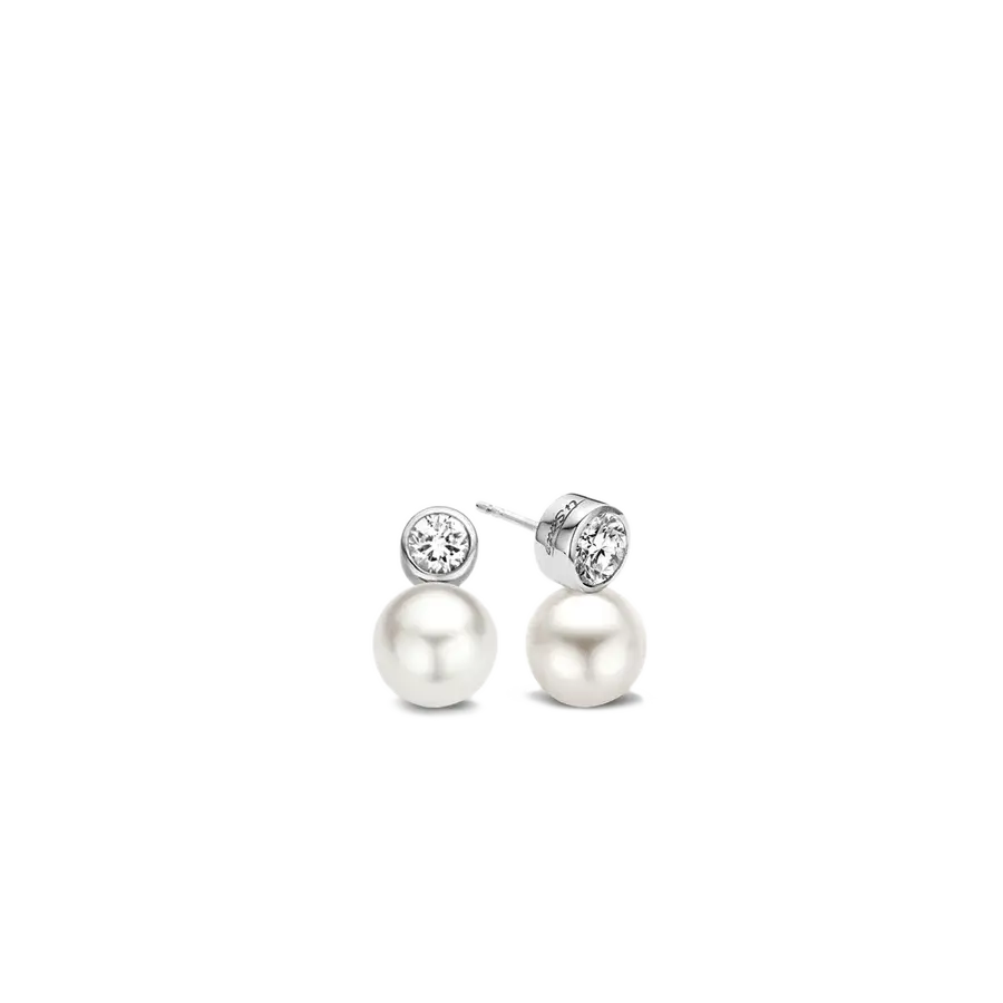 These TI SENTO earrings are made from rhodium plated sterling silver and set with white pearls and zirconias. A single 8 millimetre pearl is set below each stud, which is itself formed from a bezel-set brilliant-cut cubic zirconia.